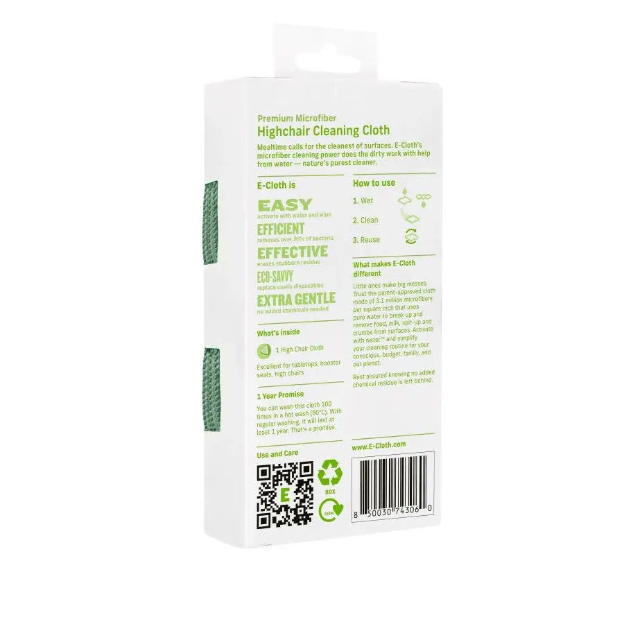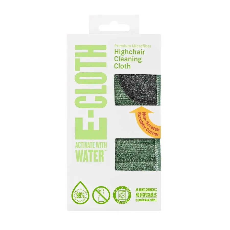 The perfect mealtime companion, the E-Cloth High Chair Cloth makes quick work of spills, smudges, crumbs, and fingerpainted foods. Masses of precision-engineered microfibers attract and leftovers and over 99% of bacteria, with help from only water's natural cleaning might. Just dampen and wipe the high chair, booster seat, or table top, using the sewn-in scrubbing corner for stubborn, dried on residue. With no need for spray, cleanup is quicker — and you avoid ingredients that could linger in the air and on surfaces around baby.