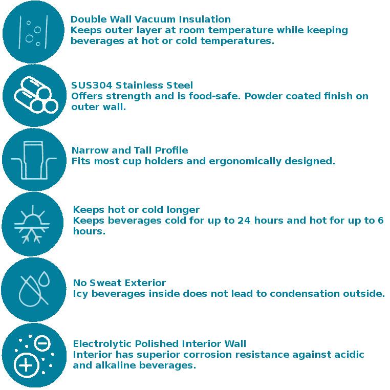 Enjoy your all your hot and cold beverages on the go with this Vacuum Insulated Bottle offering both straw and direct drinking options. Made from food-safe SUS304 Stainless Steel, they are strong, durable, corrosion resistant and comes with a powder coated outer paint layer that is both beautiful and scratch-resistant. The base is narrow to fit into most cup holders.