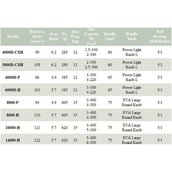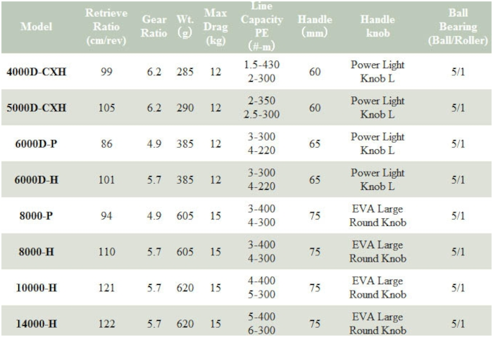 Full metal (Aluminium) body is equipped with a large diameter tough digital gear and a screw-in handle to achieve powerful winding. Equipped LC-ABS for "trouble-free" & "flying distance UP". Comes with an EVA round knob that is slip resistant and easy to apply force even when it is wet. We have the smaller sizes of 4000 and 5000, it supports wide range of salt lure games, from popular light shore jigging to offshore targets.