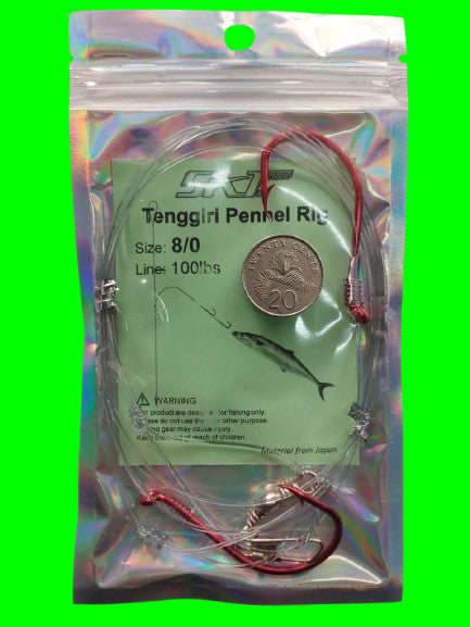 The Tenggiri Pennal Rig is a proven setup for targeting powerful Spanish Mackerel in both coastal and offshore waters. Designed for maximum hook-up efficiency, this rig features a dual-hook configuration both fixed allowing precise bait presentation with small bait fish.